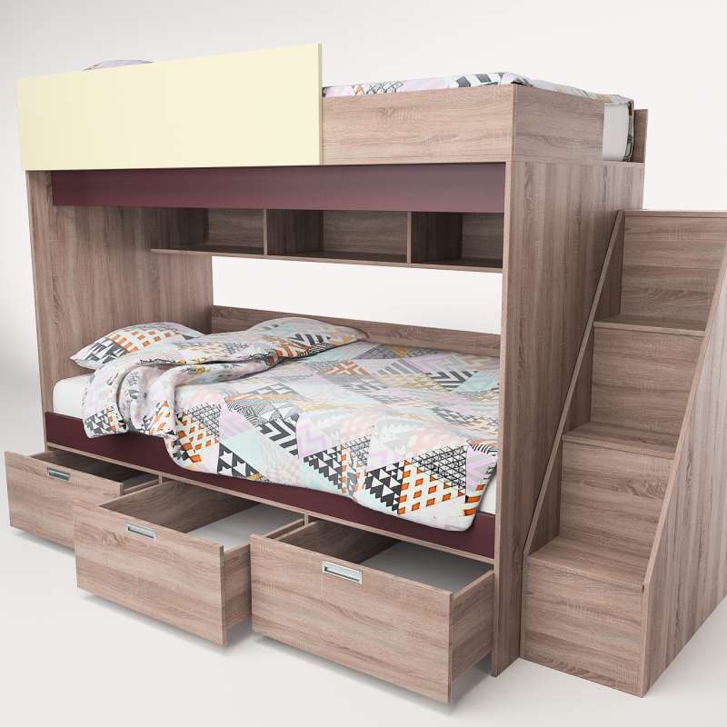 Особенности модели: Детали кровати, которые в эксплуатации подвержены механическим повреждениям, облицованы кромкой ПВХ толщиной 2 мм. Спальные места 1950*900 мм. Основание щитовое, в нижней части основания установлены три выдвижных ящика. Лестница крепится к кровати стяжками колпачковыми. Может быть собрана как в правом, так и в левом исполнении. Дополнительно можно доукомплектовать шкафом для одежды. Расстояние между верхним и нижним ярусами 930 мм.