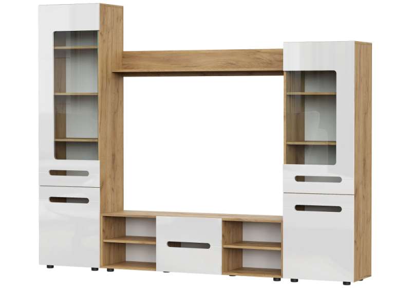 Готовая гостиная Fang в цвете дуб золотой и белый глянец — это идеальное решение для современных интерьеров, сочетающее стиль и функциональность. Размеры 240,3x37x190 см делают её подходящей для просторных и компактных помещений.