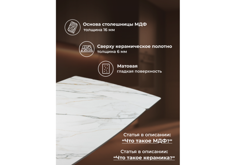 Расстояние между ножками: 80 см. Толщина столешницы: 2 см.
